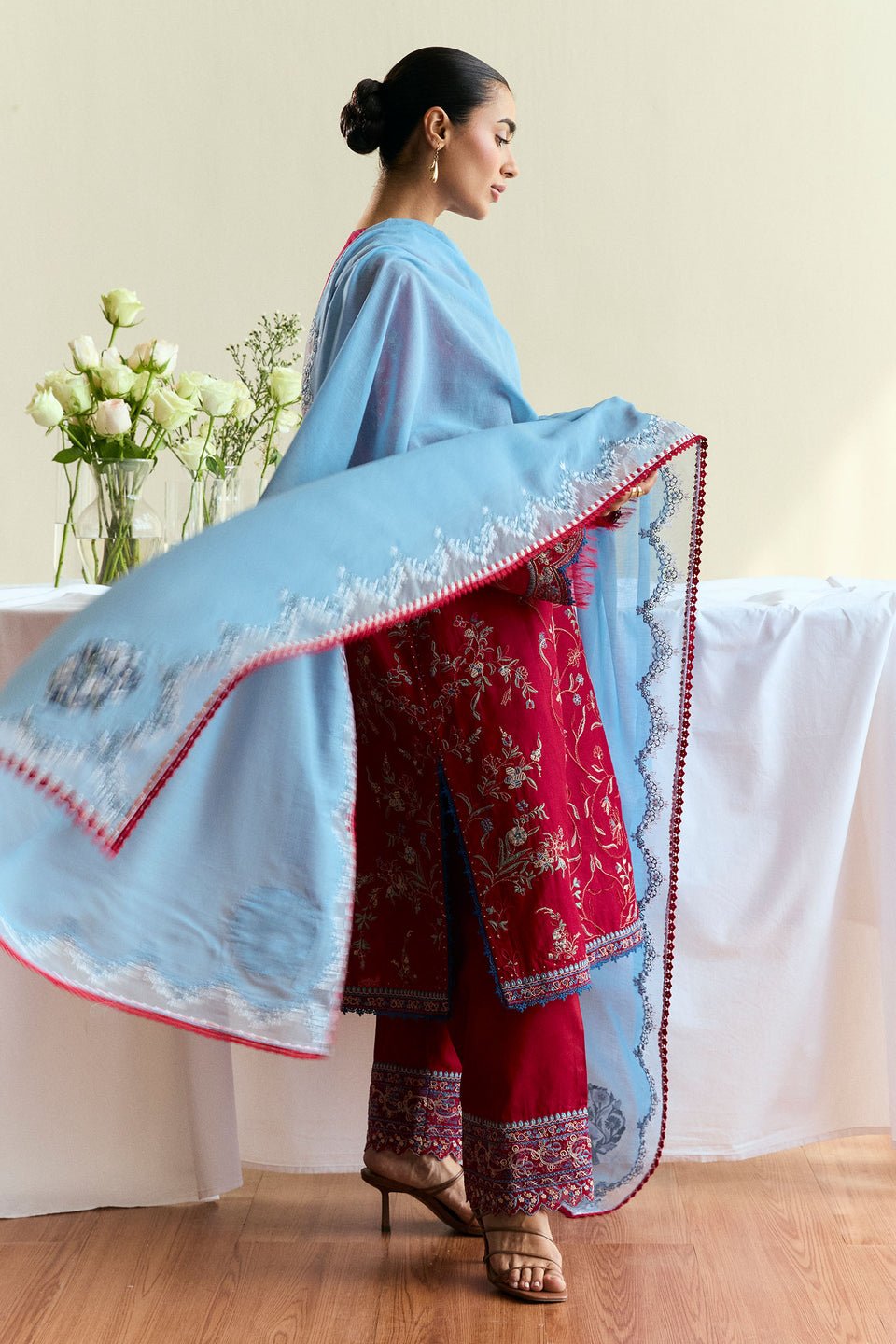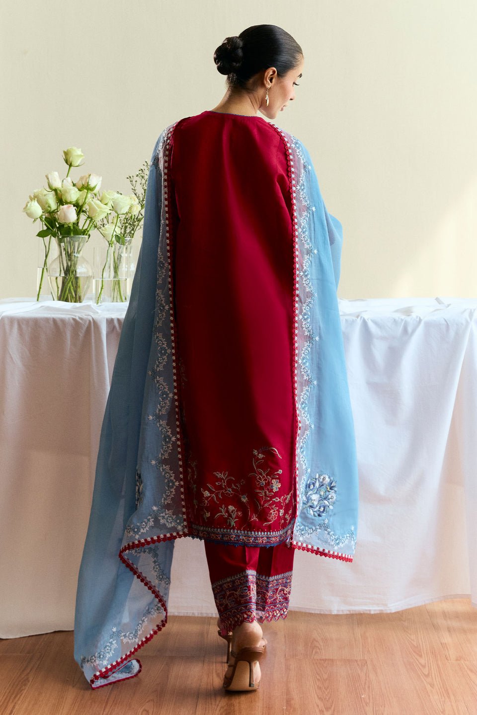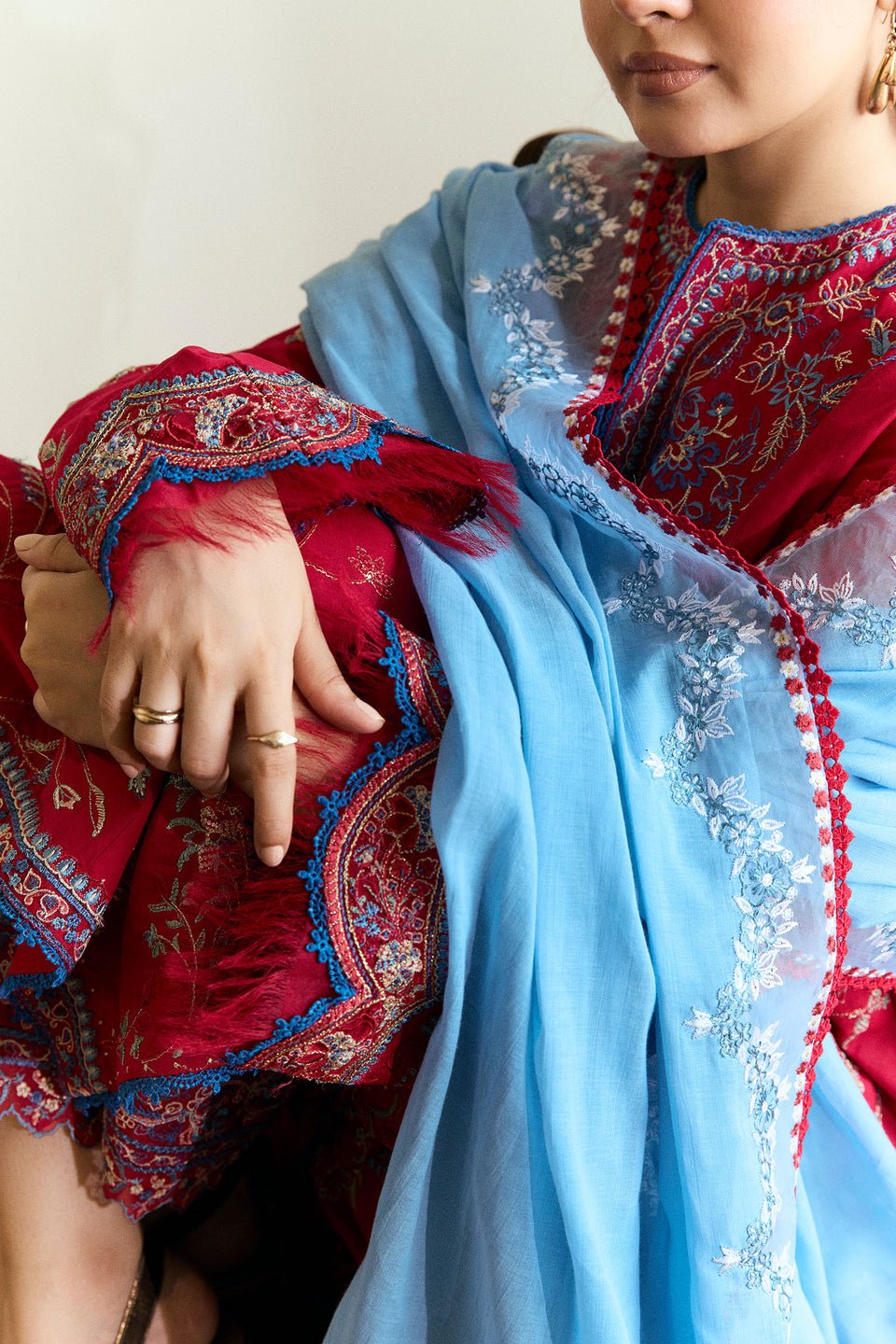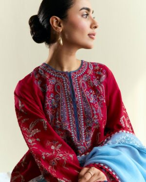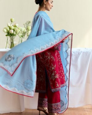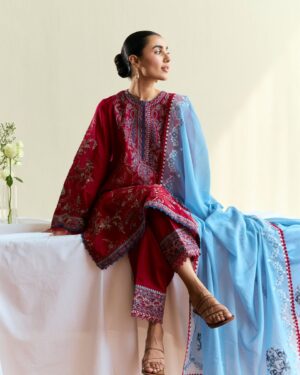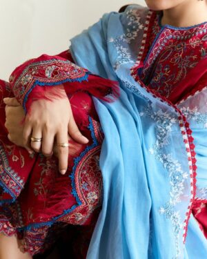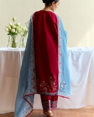 maroon red canvas brought to life with sky blue embroidery and airy organza borders—this unstitched set blends tradition with an easy, everyday charm. Light, effortless, and made for summer days.