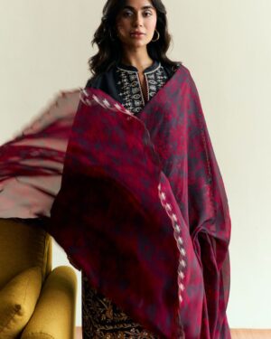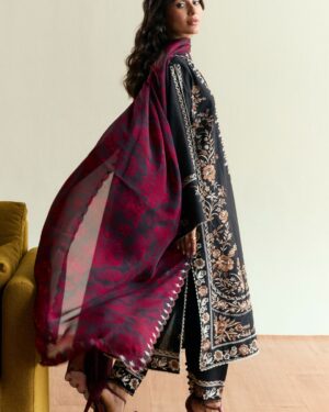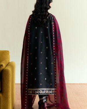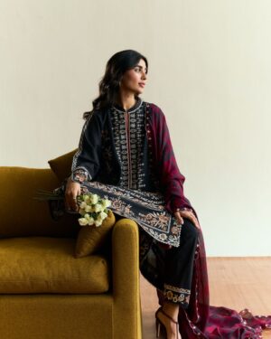 timeless black light jacquard, delicately embroidered in soft beige and paired with a rich maroon silk dupatta—this unstitched set is both striking and easy to wear.