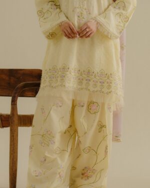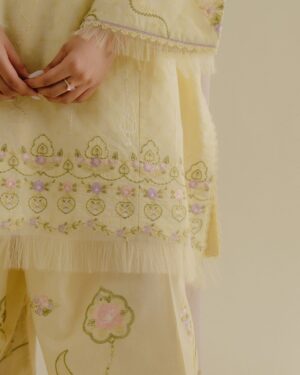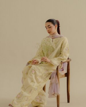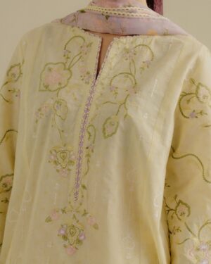 soft buttercup yellow base adorned with delicate embossed textures and fine tonal embroidery, capturing a light and effortless elegance, finished with a breezy chiffon dupatta for a graceful touch.