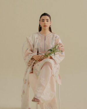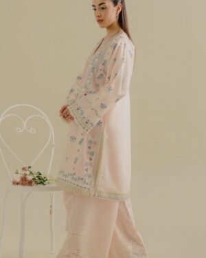 The peachy pink jacquard, paired with a jacquard dupatta and composed embroidery, creates a soft yet sophisticated look with intricate detailing.