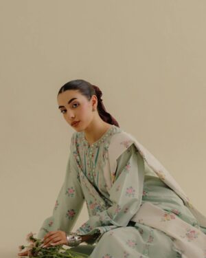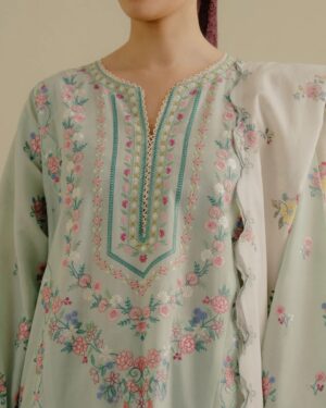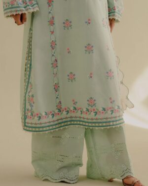 The mint green jacquard, paired with a jacquard dupatta and composed embroidery, features mid-tone detailing for a balanced and refined design.