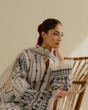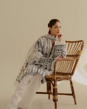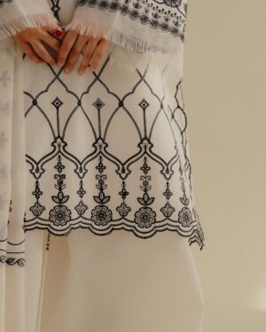 A crisp white lawn piece lifted with bold, playful embroidery in vibrant tones, finished with a cotton silk dupatta that adds a smooth, graceful layer to the look.