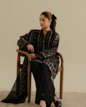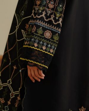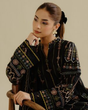 A deep black ensemble brought to life with bold, vibrant embroidery in striking solid tones — a crisp, standout summer statement.