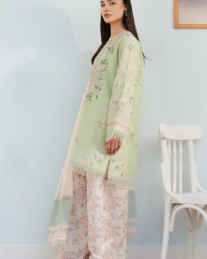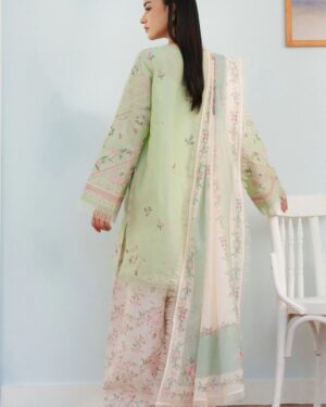 A pistachio green ensemble featuring floral embroidery, complemented by printed trousers and a statement dupatta for a refined, feminine look.