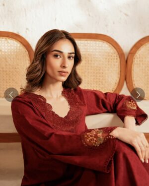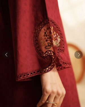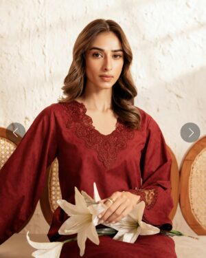 This ensemble features a deep red long shirt made from self-jacquard fabric, which offers a refined, smooth texture, giving the piece an understated elegance. The bold deep red color provides a striking pop, ensuring the shirt stands out. Paired with relaxed cotton trousers, this outfit perfectly combines style and comfort. The breathable cotton fabric ensures a soft and easy fit, making it ideal for both casual and semi-formal occasions. Whether worn for a day outing or a more polished event, this outfit exudes effortless charm and modern sophistication.