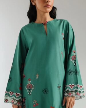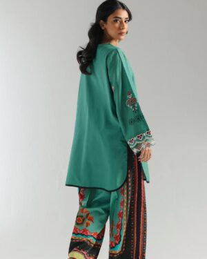 A classically chic composition is portrayed on this style statement outfit. It features a contemporary luscious green shirt beautifully adorned with captivating floral designs embroidered in vibrant colors. Paired with a trendy printed culotte trouser adorned with attractive prints. A great addition to your spring season wardrobe.