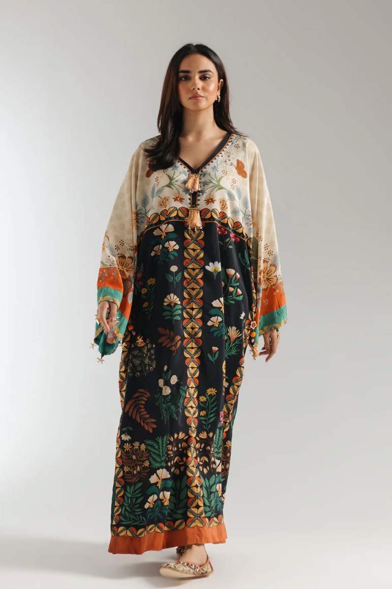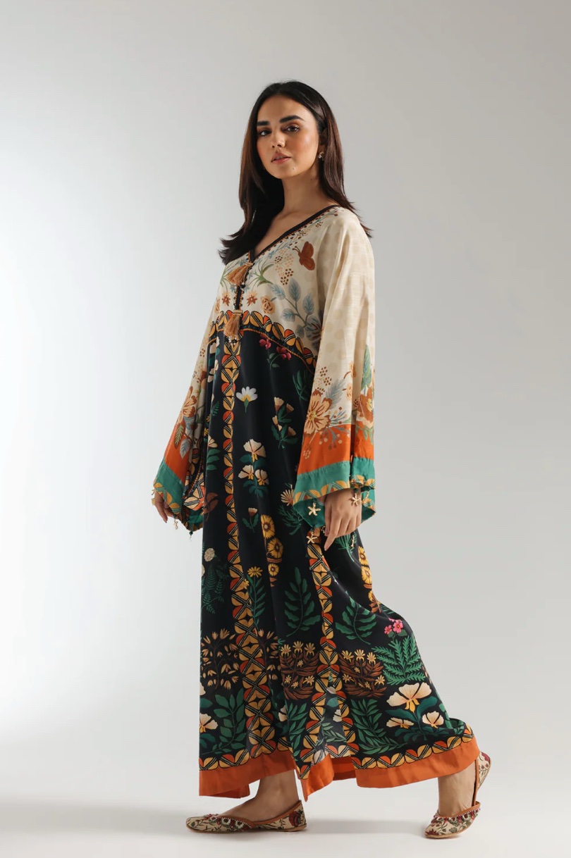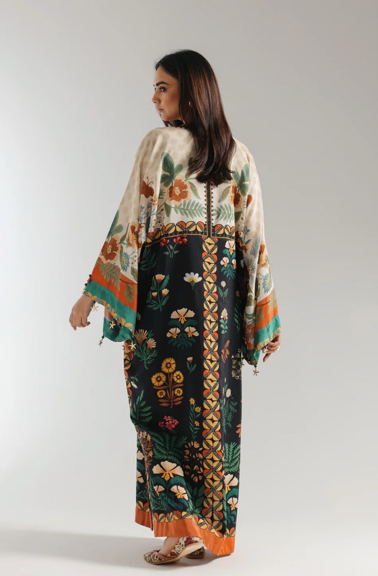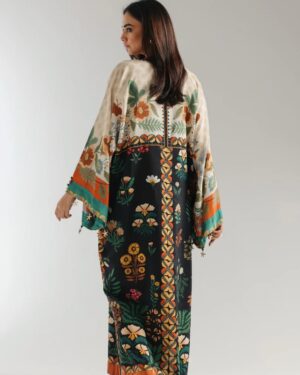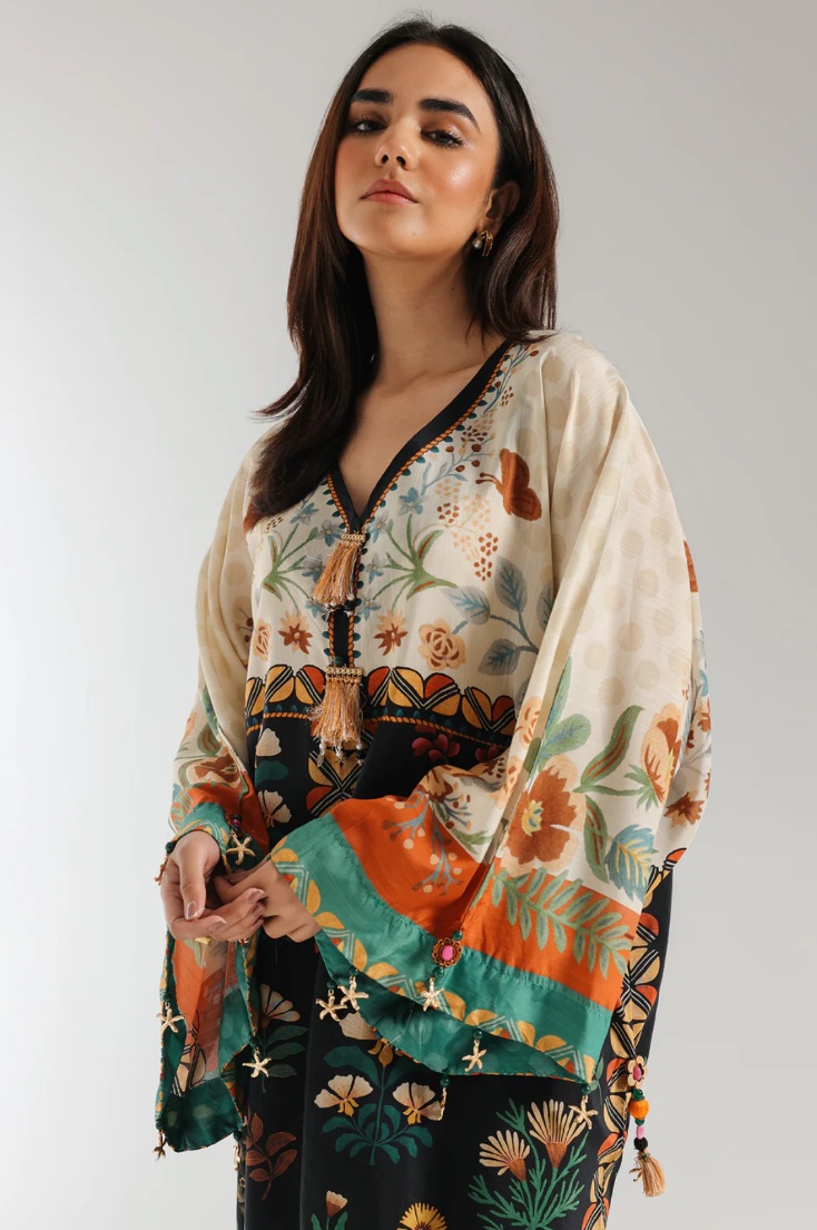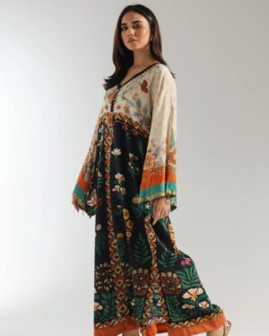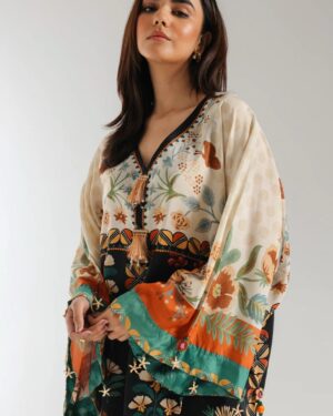 A contemporary composition is layered on this elegant elongated shirt crafted in a trendy silhouette with low side slits. Beautifully adorned with fascinating floral prints illustrating artistic designs and enhanced with dazzling add ons at front neck and sleeves opening. Style this graceful and statement outfit at happening events this season.