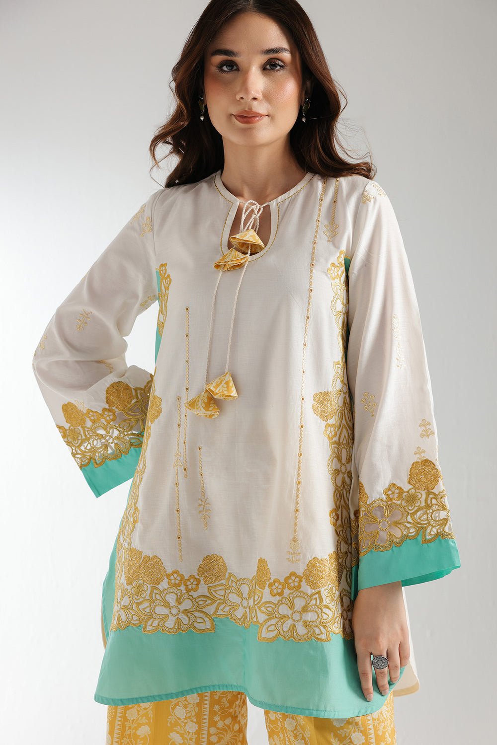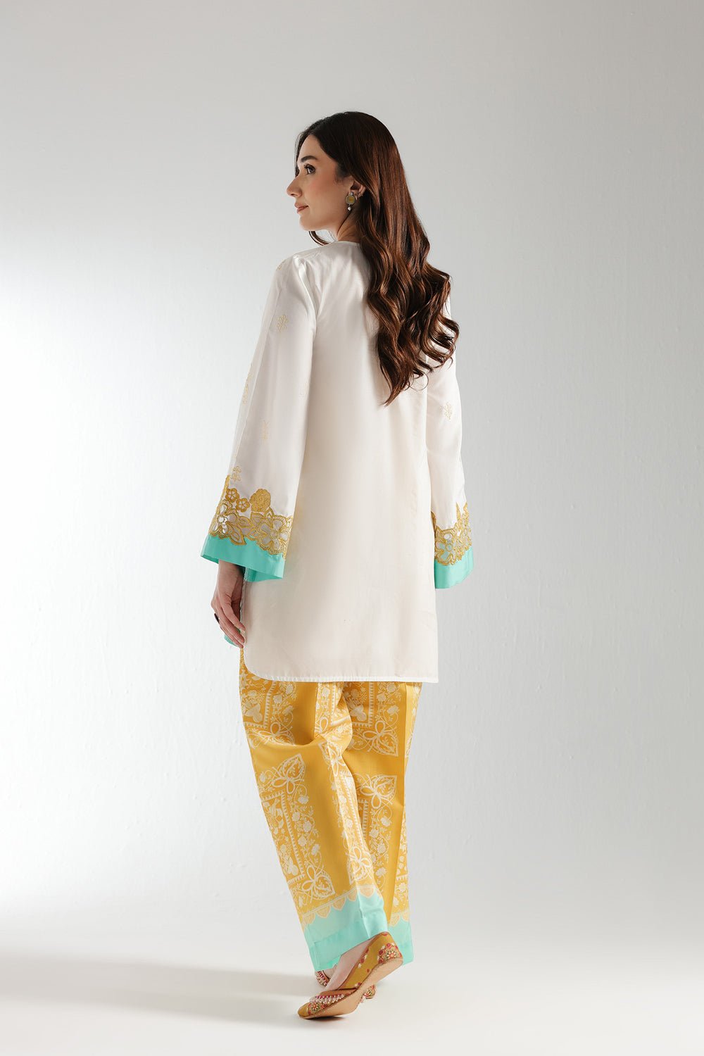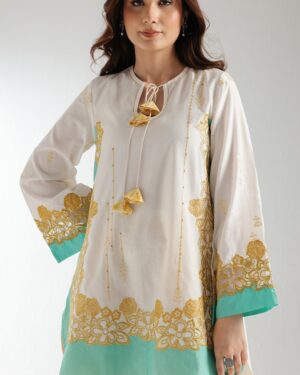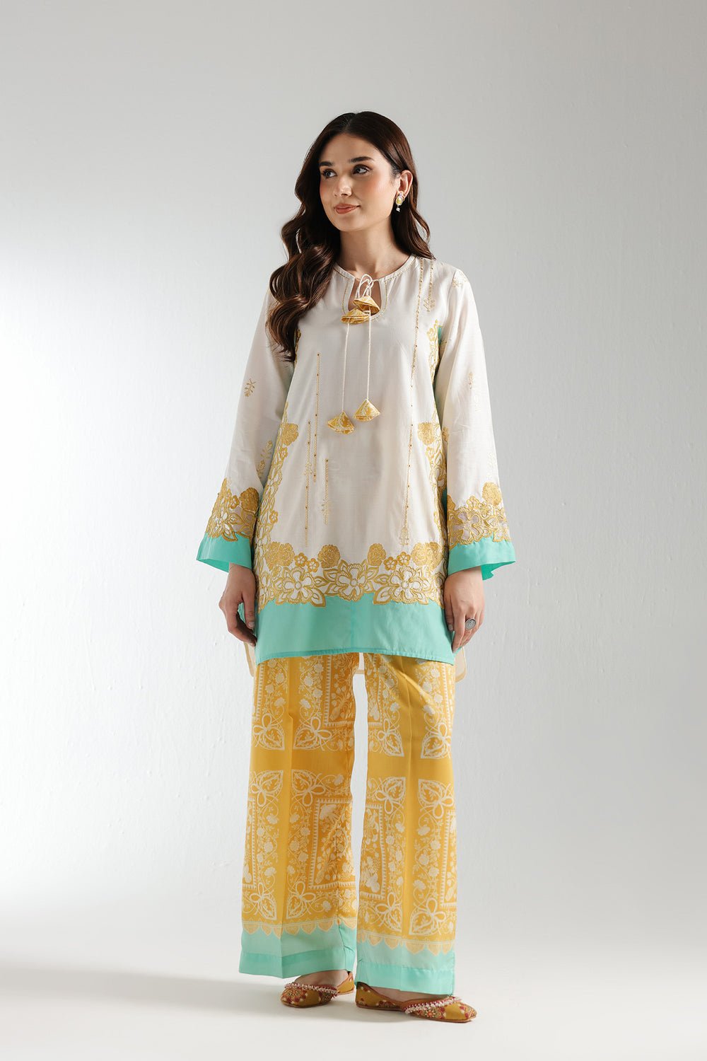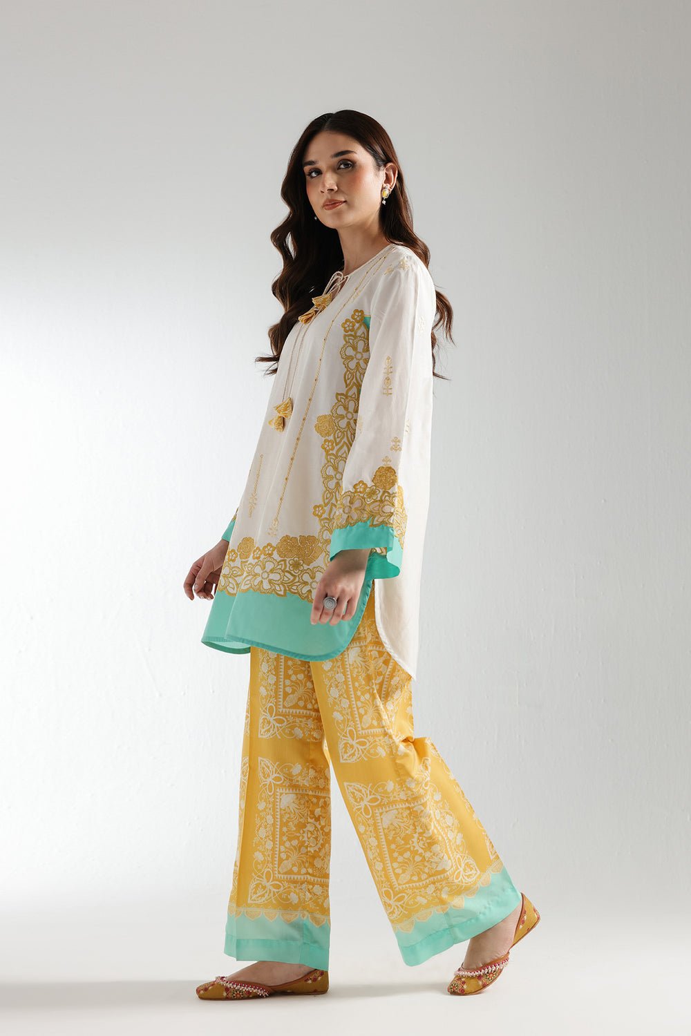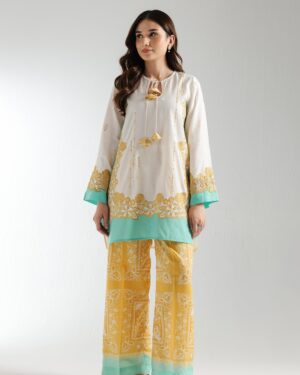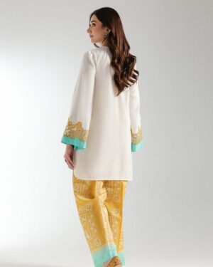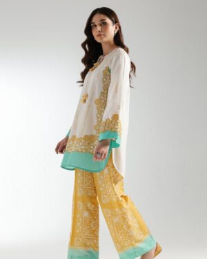 A classically chic composition is portrayed on this style statement outfit. It features a contemporary shirt beautifully adorned with captivating floral designs embroidered in vibrant mustard color. Paired with a contemporary culotte printed trouser. A great addition to your spring season wardrobe.