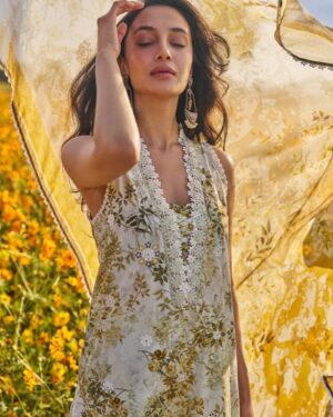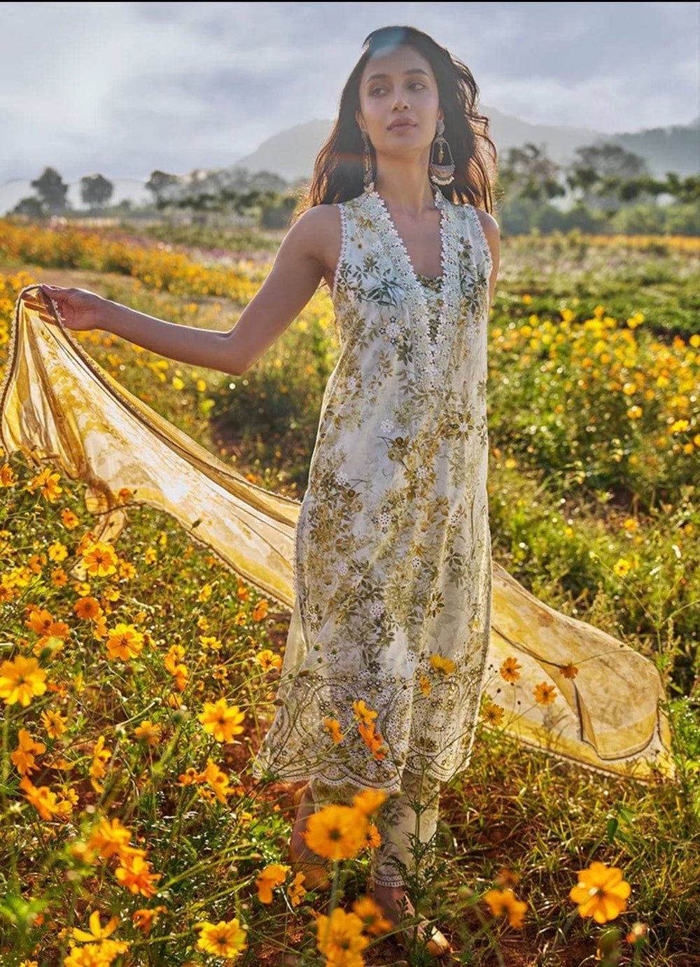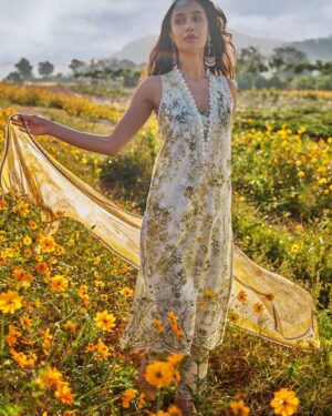 Enjoy the colours of a warm sunrise in this gold yellow outfit, Sabeen is filled with peonies and daffodils. The intricate schiffli embroidery on the daman captures the eye. The beautiful floral pattern continues on the flowy chiffon dupatta and trousers.