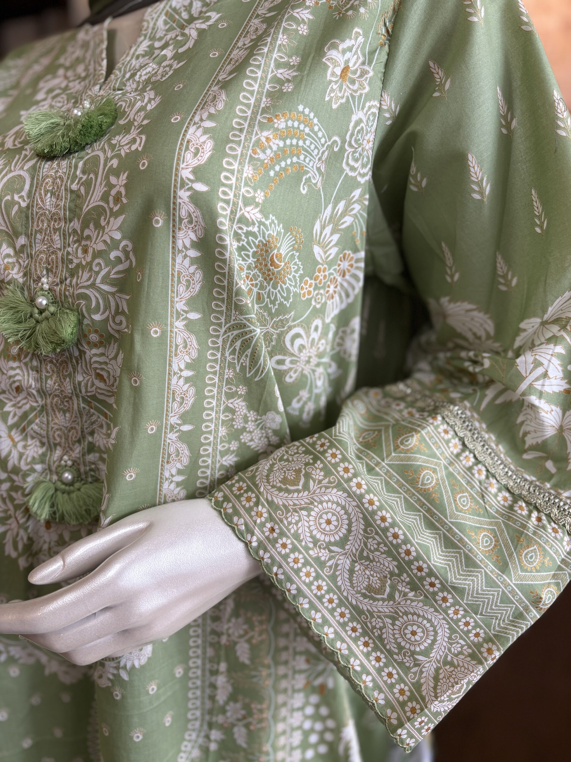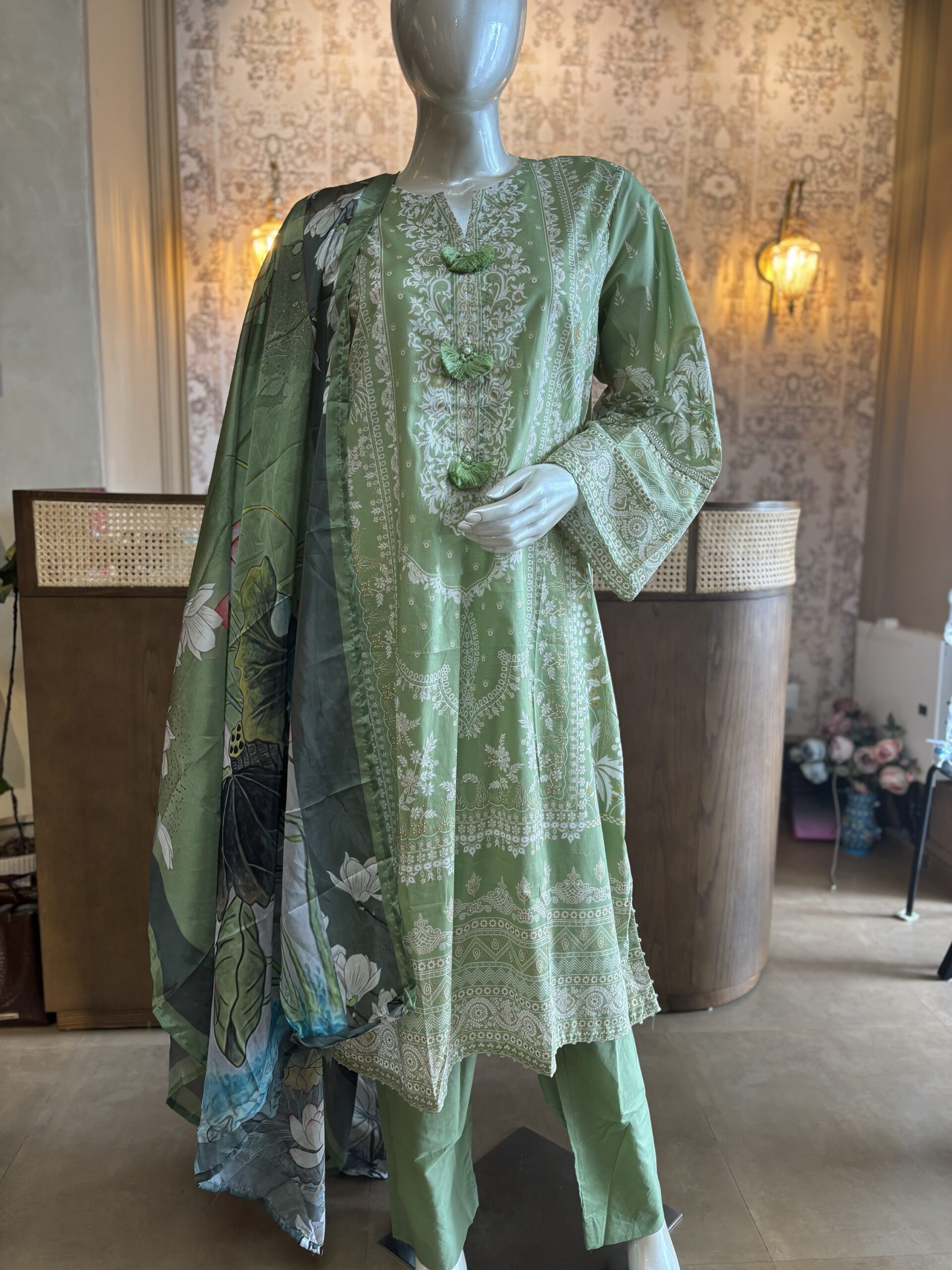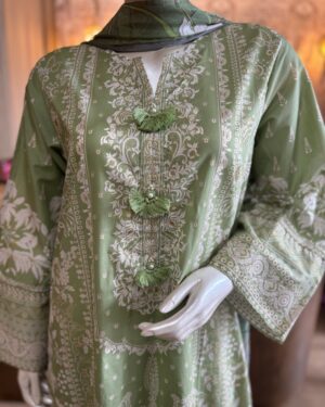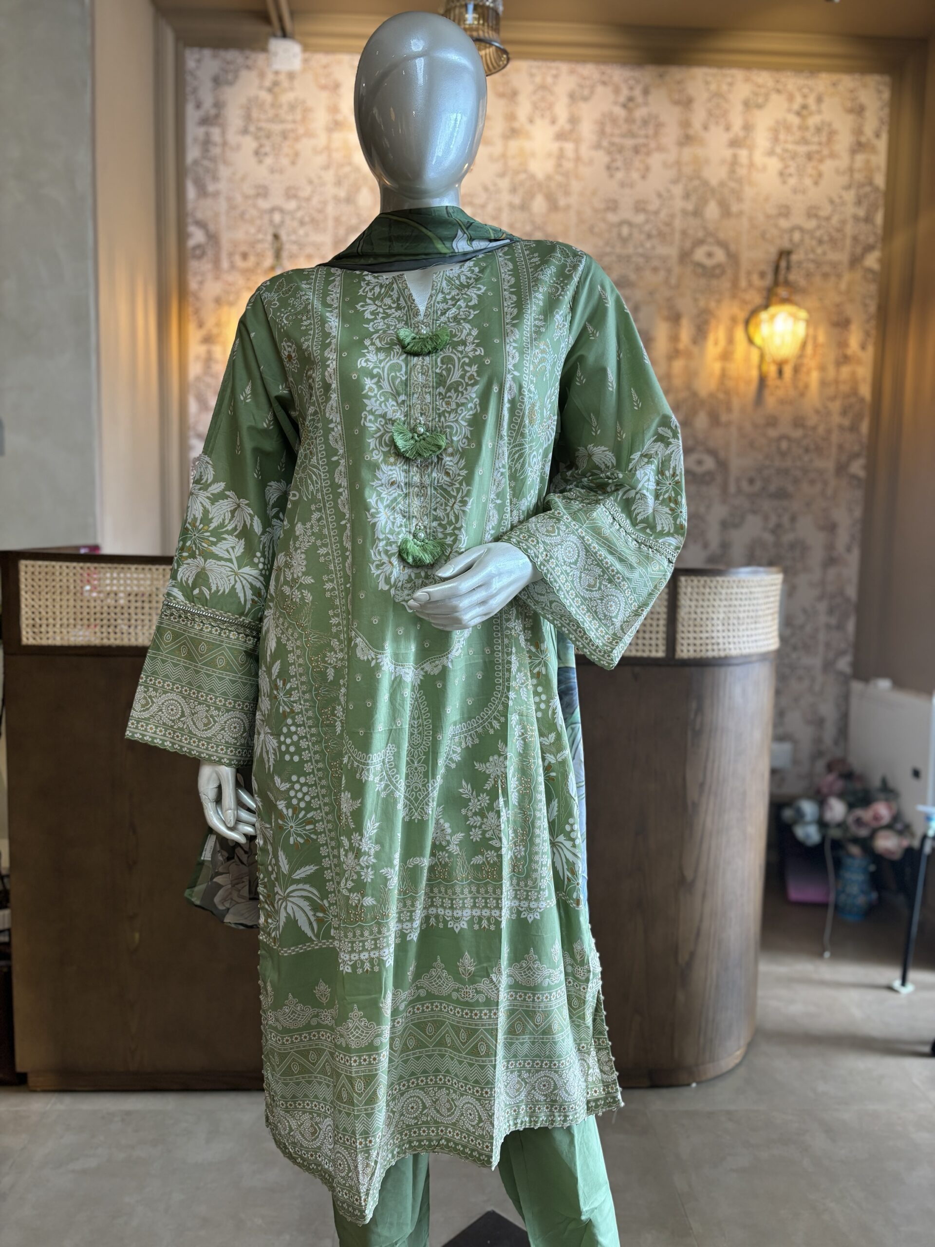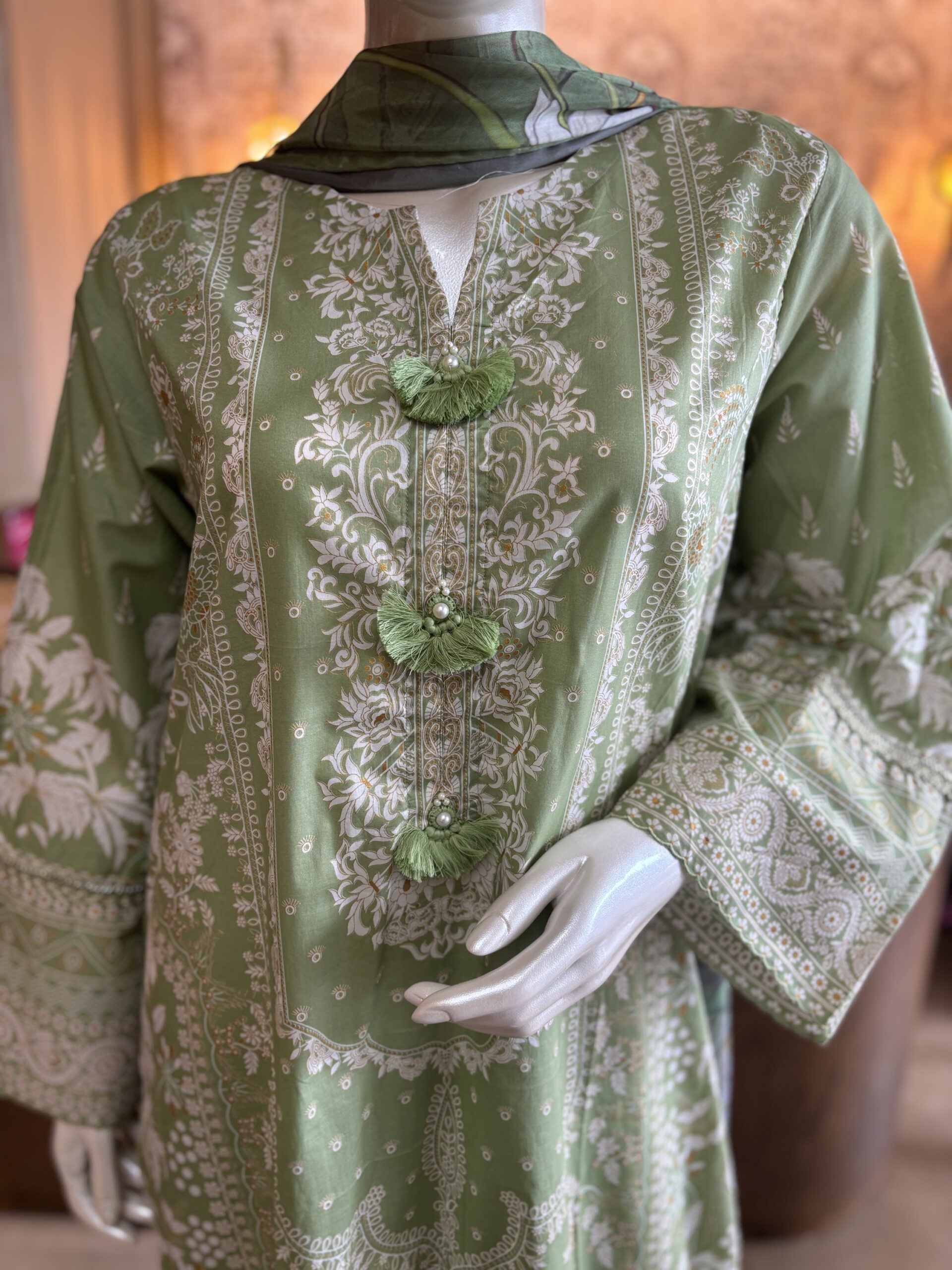Collection: Gold & Printed Lawn Shirt, Dyed Lawn Trouser, Digital Printed Silk Dupatta