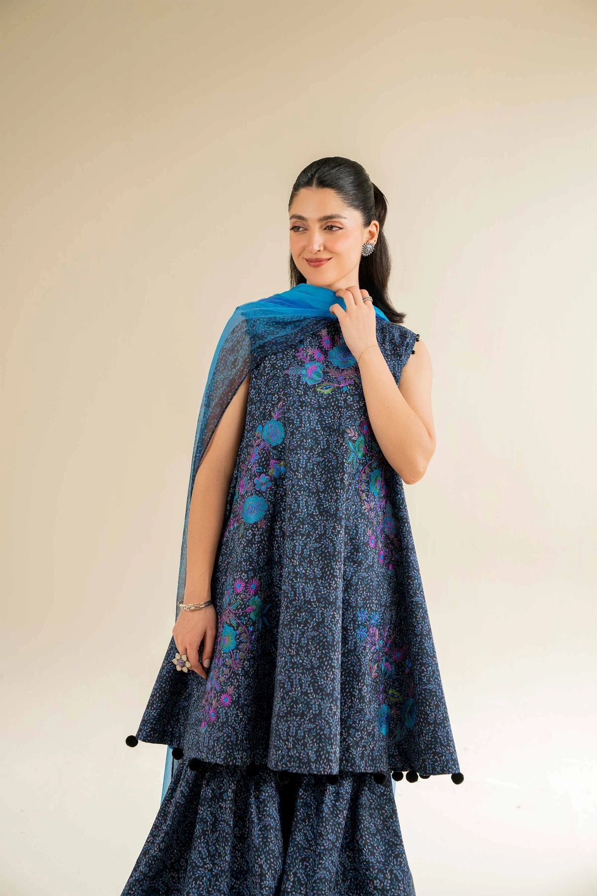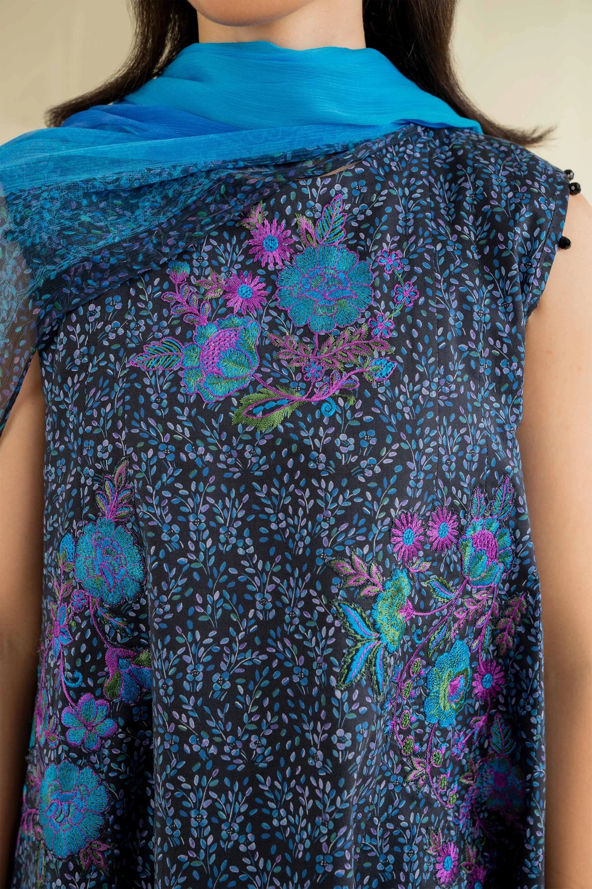 Exude grace in this printed embroidered three-piece from the latest unstitched summer collection.