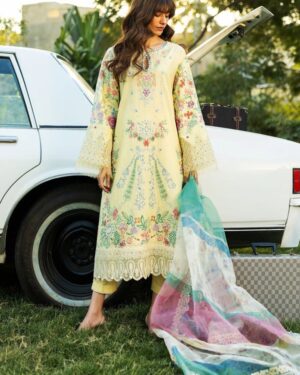 Embroidered lawn Center Panel – 1 piece Embroidered lawn Side Panels – 1 piece Embroidered lawn Back – 1 yard Embroidered lawn Sleeves – 0.72 yard Embroidered organza back patch – 1 piece Embroidered organza sleeve border – 45″” Embroidered organza shirt border – 2 yard Embroidered organza trouser border – 2.16 yard Embroidered organza dupatta border – 8.7 yard Printed organza dupatta – 2.7 yard Dyed Cambric Trouser – 2.16 yard