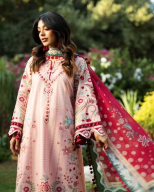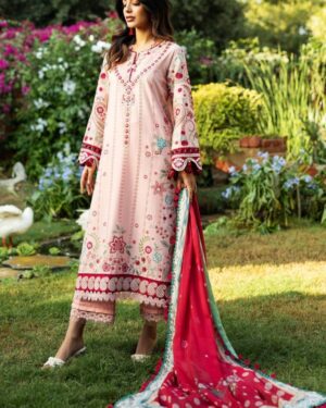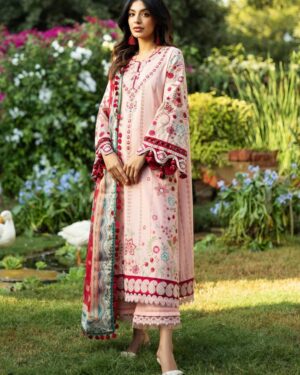 Embroidered lawn Center Panel – 1 piece Embroidered lawn Side Panels (L+R) – 1 piece Embroidered lawn Back – 1 yard Embroidered lawn Sleeves – 0.72 yard Embroidered neckline organza – 1 piece Embroidered shirt border on charmeuse silk – 2 yard Embroidered sleeve border on charmeuse silk – 2 yard Digital Printed silk dupatta – 2.7 yard Dyed Cambric Trouser – 2.16 yard