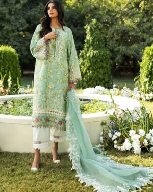 Digitally printed lawn Center Panel – 1 piece Digitally printed lawn Side Panels – 1 piece Digitally printed lawn Back – 1 yard Digitally printed lawn Sleeves – 0.72 yard Embroidered organza sleeve border – 45″” Embroidered organza shirt border – 2 yard Embroidered organza dupatta – 2.9 yard Embroidered organza dupatta palu – 2.5 yard Dyed Cambric Trouser – 2.12 yard