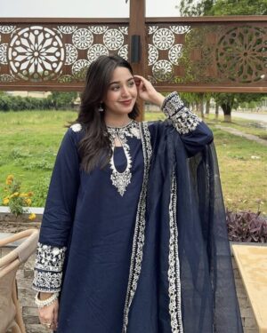 Experience elegance with our exquisite Blue Dilara ensemble. This article features Blue embroidered neckline and sleeves along with embroidered cotton net dupatta.