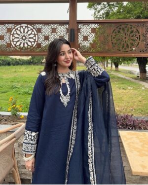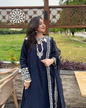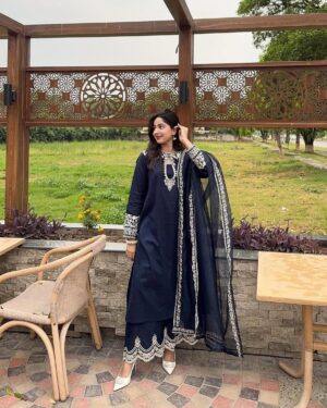 Experience elegance with our exquisite Blue Dilara ensemble. This article features Blue embroidered neckline and sleeves along with embroidered cotton net dupatta.