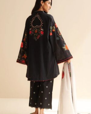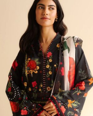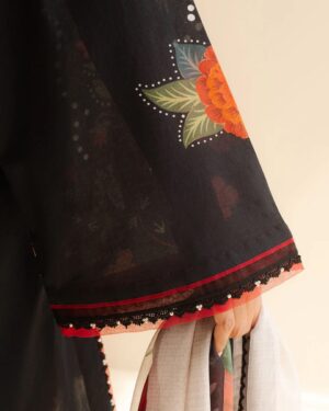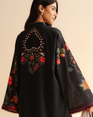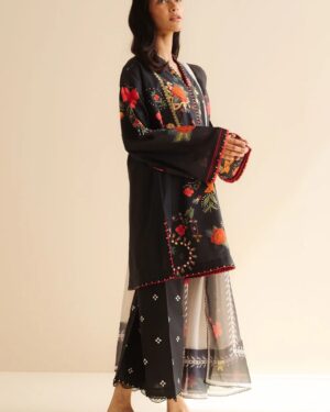 A bold black and red floral shirt balanced with wide-leg trousers and a subtle dupatta to create an understated statement.