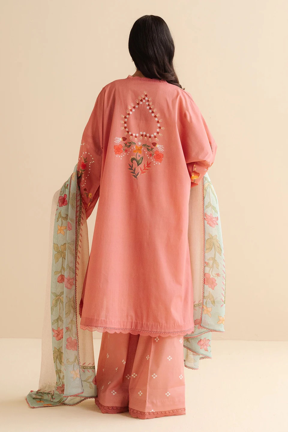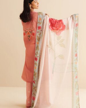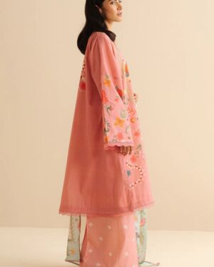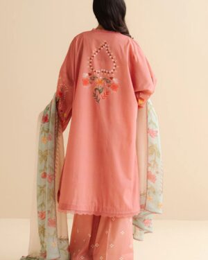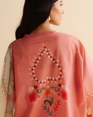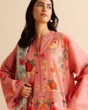 A statement pink printed shirt with structured embroidery, matched with minimalistic trousers and a soft, white blush-toned dupatta.
