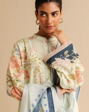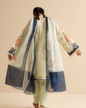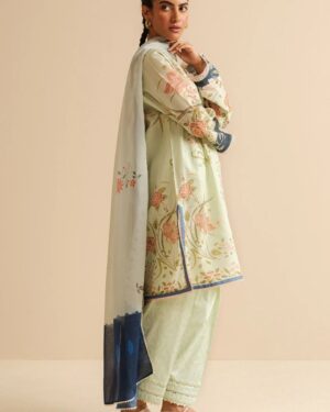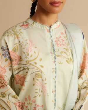 A breath of subtle elegance, this pastel mint ensemble is adorned with delicate floral motifs in blush pink and olive green, evoking the quiet poetry of a spring garden.