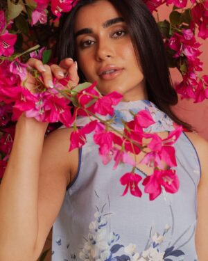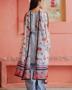 vibrant light blue kurta styled with wide-hem pants complemented by a printed silk dupatta in shades of blue with oversized floral patterns.