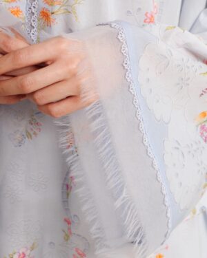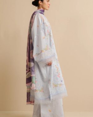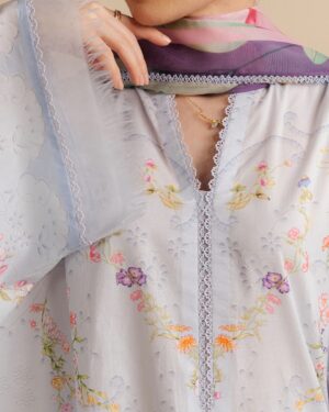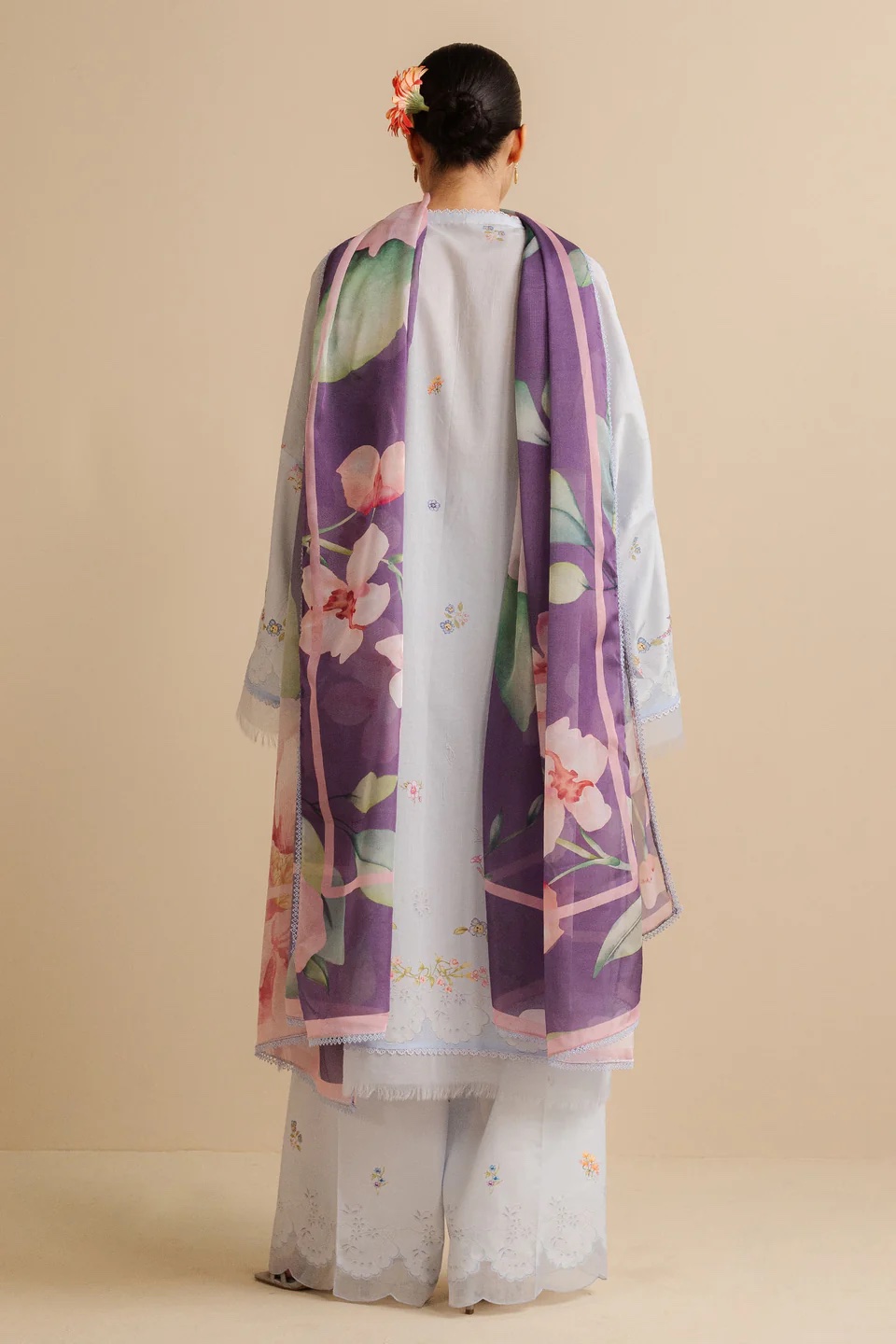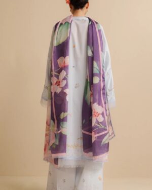 A soft powder blue shirt adorned with delicate pastel florals pairs seamlessly with matching embroidered trousers, while the statement dupatta bursts with bold, oversized blooms in rich purples and pinks.